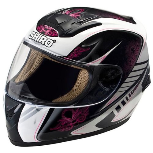 Casque intégral SHIRO SH-821 MOTION rose, blanc et noir à coque aérodynamique en résine ABS, vernis à protection UV, intérieur démontable et lavable, cache-nez, visière anti-rayures, ouverture rapide, aération intérieure à effet venturi, boucle micrométrique